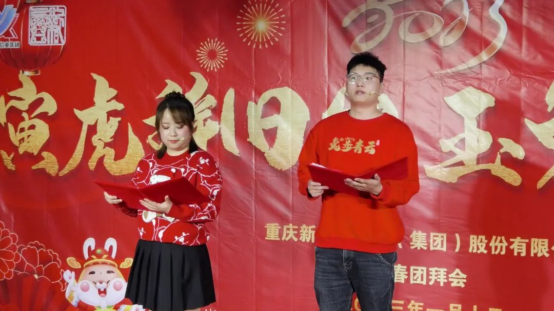 在經(jīng)久不息的掌聲和歡呼聲中,團(tuán)拜會主持人唐春和湯有靜閃亮登場!