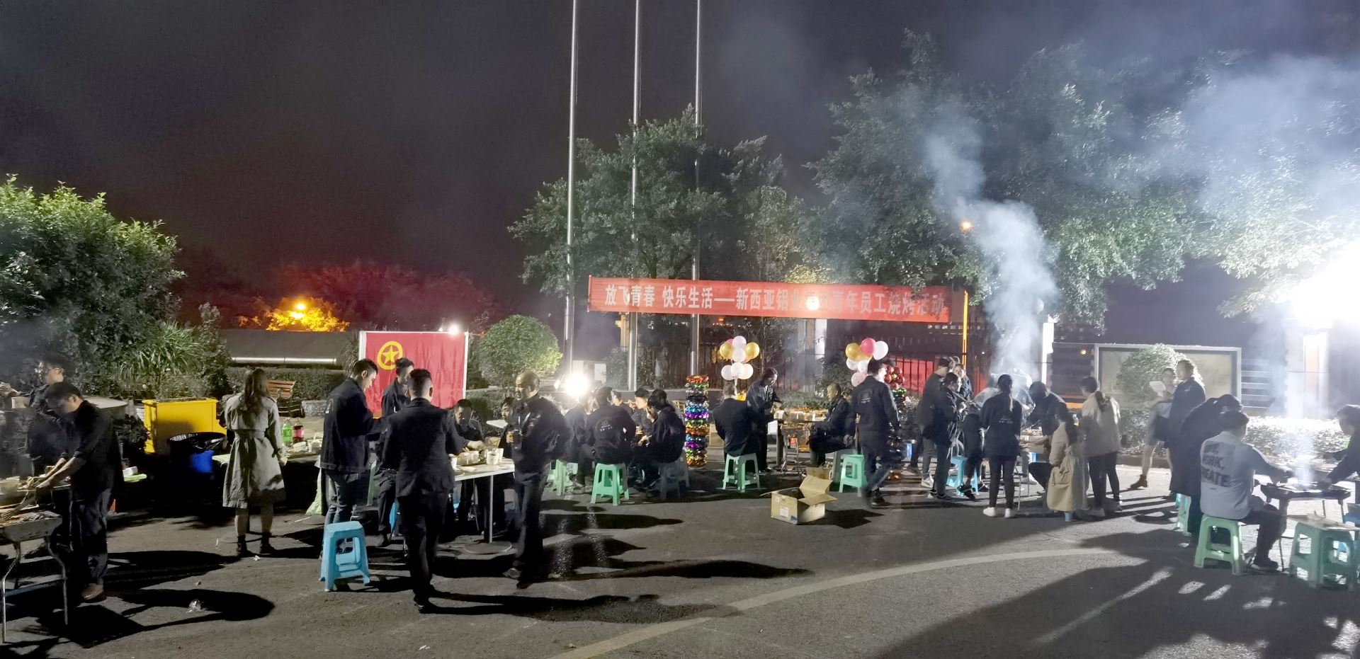 夜色中的新西亞燈火輝煌,“放飛青春、快樂生活——重慶新西亞鋁業集團青年員工燒烤活動”橫幅懸掛,鮮艷的團旗,五顏六色的彩球,光彩奪目的彩柱,豐富多樣的燒烤食材和現場布置有序的活動裝備,裝扮出了濃濃的活動氛圍。