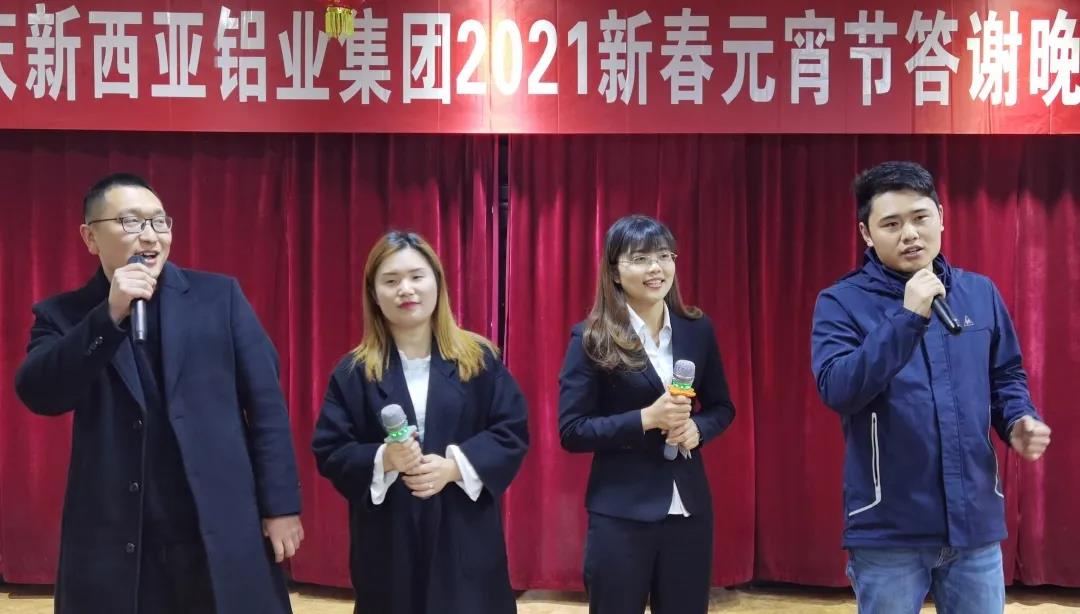 銀鼠辭舊歲,金牛踏春來(lái)。2月26日晚,新西亞鋁業(yè)集團(tuán)在公司食堂大廳開(kāi)展了以“歡天喜地過(guò)大年、歡歌笑語(yǔ)鬧元宵”為主題的2021新春元宵佳節(jié)答謝晚宴。集團(tuán)公司全體股東、領(lǐng)導(dǎo)班子、全體新西亞員工230余人齊聚一堂,共享晚宴帶來(lái)的新春祝福和歡樂(lè)。晚宴由鋁裝飾事業(yè)部市場(chǎng)開(kāi)發(fā)部經(jīng)理唐春主持。