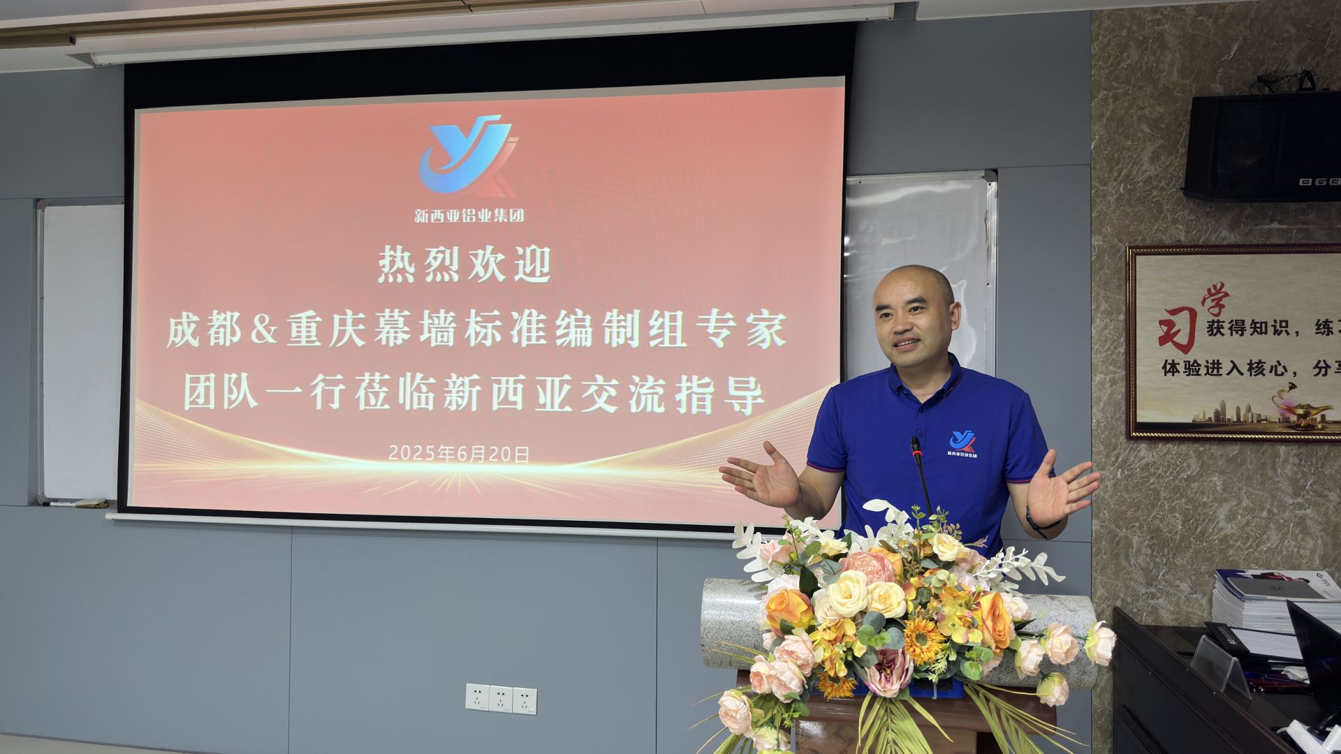 集團總經理劉斌在致辭中首先對編制組各位專家的到來表示熱烈歡迎和衷心感謝。他表示,新西亞鋁業始終秉持“以鋁深加工為核心,裝飾帶建材、建材促裝飾”的同心多元化戰略,深耕“鋁裝飾、鋁家居、鋁建材、鋁科技、鋁勞務、鋁板材”領域。此次有幸成為重慶市《既有建筑幕墻門窗維護與改造工程技術標準》的參編單位,并榮幸承辦本次交流活動,這不僅是對新西亞過往技術積累與行業貢獻的肯定,更賦予了新西亞沉甸甸的責任。
